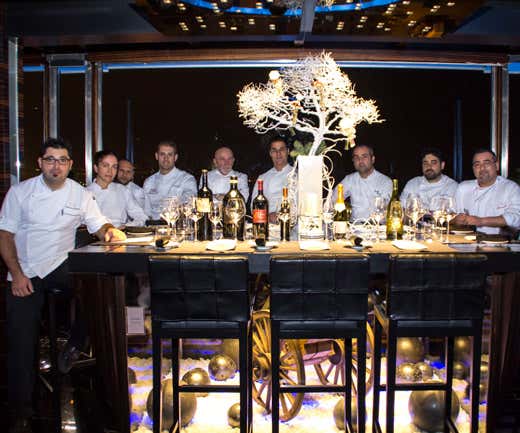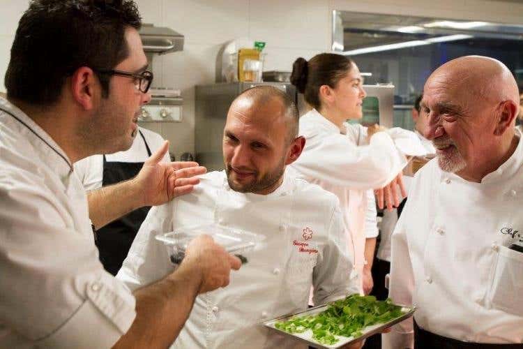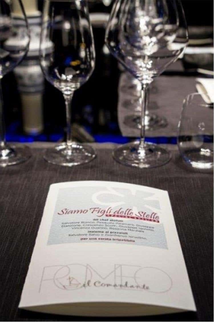 nella foto, primo a sinistra). E Salvatore, dal management della struttura coadiuvato e ben supportato, cosa fa? Nell'imminenza delle festività di fine anno (e a pochi giorni dall'uscita dell'edizione 2016 della "rossa") diviene il resident chef e invita, per una cena che si rivela sontuosa e memorabile, sei suoi colleghi stellati. Praticamente il top della ristorazione. "Siamo Figli delle Stelle" il titolo della serata.