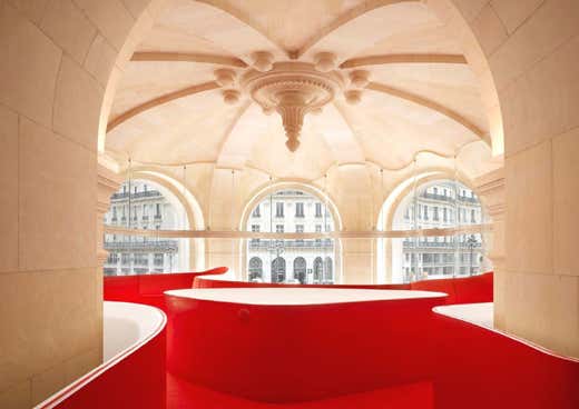 Sarebbe stato certamente più facile pensare a un ristorante classico, in un palazzo dello stile dorato e ornato di statue come l’opera parigina. Ma un po’ la passione dei giovani ristoratori, che venivano da un’altra esperienza prezzo gli Champs Elysées, ora venduta, un po’ l’innovazione del progetto dell’archistar francese Odile Decq, hanno fatto il miracolo: l'Opéra Restaurant. La realizzazione è stata difficile, perché non si è potuto toccare nulla: tutto l’allestimento è giustapposto alle antiche colonne della struttura originaria e può essere integralmente smontato.