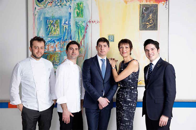 I cuochi Alessandro Negrini e Fabio Pisani, il maitre Nicola Dell'Agnolo, la direttrice Stefania Moroni e il sommelier Alberto Piras (foto: Sara Magni)