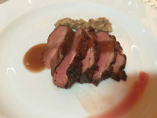 Un notevole petto d’anatra con castagne si è abbinato senza alcuna sbavatura a un interessantissimo Brut pas dosè, Il Soutiran (60% Chardonnay e 40% Pinot noir), 5 anni sui lieviti, in legno, un gran cru secco e astringente con grande struttura e perfetto per il piatto di Graziano Foresti (55,00€).