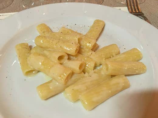 Fuori dalle regole scontate anche l’ultimo abbinamento, riuscito nonostante fosse forse il più difficile. Il più strutturato champagne della serata, sempre un altro Grand cru Soutiran Blanc de noirs, ma 40 mesi in legno 100% di Pinot noir, ha accompagnato un piatto di cacio e pepe che ha superato la prova per eleganza ed equilibrio della salsa. (59,00€)