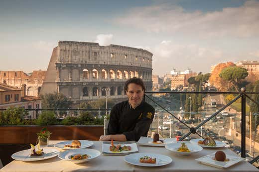 Dal 2010 è il “re” di questo gioiello con vista sul Colosseo, e che presto si arricchirà di un bistrot adiacente alla terrazza del ristorante. Di Iorio propone piatti che combinano i sapori mediterranei con quelli della cucina romana, ricette antiche personalizzate, legate alla stagionalità e all'assoluta qualità della materia prima, e qualche novità come il menu gluten free dedicato alla figlia Melissa che soffre di celiachia, e che suscita la curiosità e l'apprezzamento anche di chi non ha problemi con il glutine. Per Di Iorio, Stella confermata anche nel 2016.