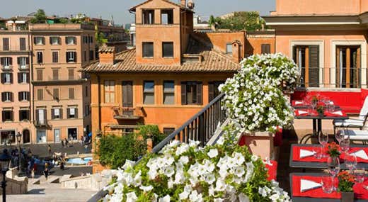 La terrazza de il Palazzetto è la location ideale, con affaccio sulla storica scalinata di Piazza di Spagna, per concedersi un pranzo veloce, un aperitivo con cocktail classici e innovativi o un buon bicchiere di vino