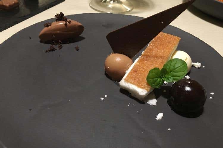 - Aperitivo (composto da Bon Bon di mozzarella acciuga e peperone piquillo, Sablé mortadella e pistacchio, Roll di daykon salmone in tartare)