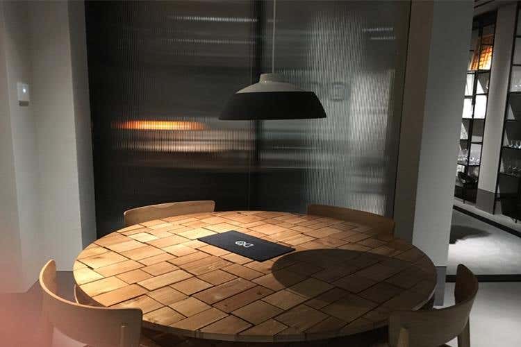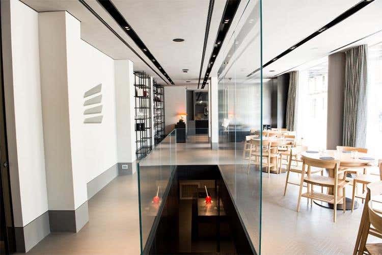 Se prima il ristorante era quasi nascosto nel vecchio stabile e tutto raccolto su se stesso, ora ampissime vetrate mettono come in vetrina tutti i tavoli e la luce (sapientemente studiata per il giorno o la sera) fa da protagonista insieme ad un rigore e ad un'essenzialità di linee e materiali scelti proprio per valorizzare il cibo.