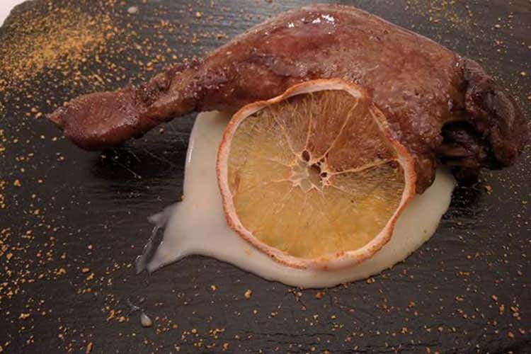 Ancora, meditato assaggio di altro pregevole primo: Chitarra al ragù bianco d’agnello, pecorino e zafferano, altro riverente omaggio all’Abruzzo. Ed eccoci al secondo: Anatra al profumo d’arancia. Ci si avvia, lenti e gaudenti i tempi, alla conclusione di tale grande esperienza e giunge in tavola Omaggio allo zafferano de L’Aquila, dessert che rende memoria alla martoriata terra aquilana. In gustoso e ben riuscito contrappunto, a rinverdire augusta tradizione, il Ratafià Praesidium fatto a Prezza, nell’aquilano.