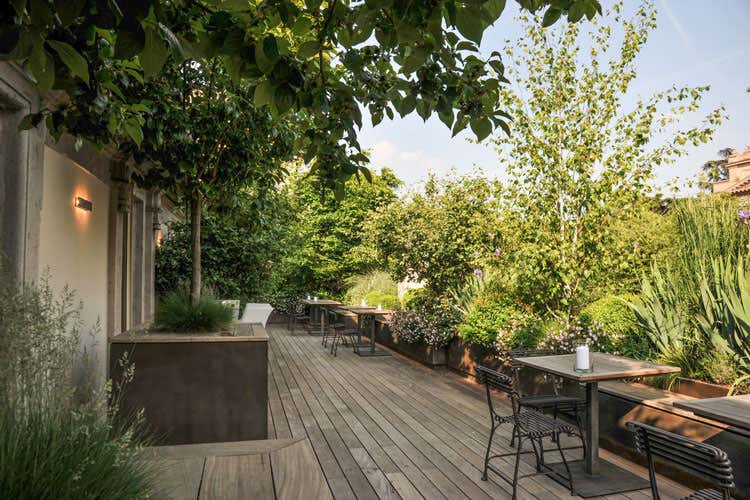 Terrazza Fausti si presenta come un giardino metropolitano, rigoglioso, fiorito e profumato in ogni stagione dell’anno grazie a graminacee ornamentali e piante erbacee perenni, come l’Amelanchier, che regala una ricca e candida fioritura in primavera, bacche rosse in estate-autunno e un ricco fogliame color rubino in autunno inoltrato.