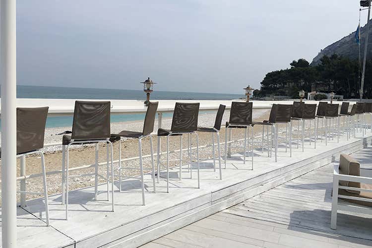 La posizione è incantevole, il locale è affiancato alla spiaggia bianca di ciottoli, protetta dal declivio del monte Conero e dalla ricca vegetazione.