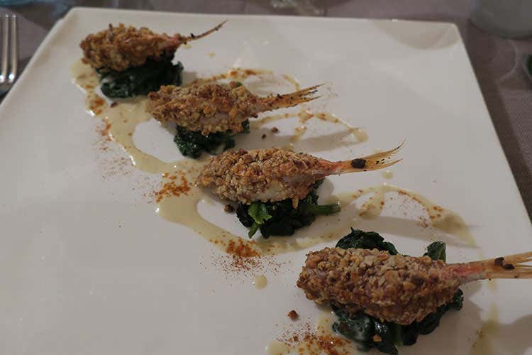 Triglie croccanti con granelle di mandorle su letto di spinaci