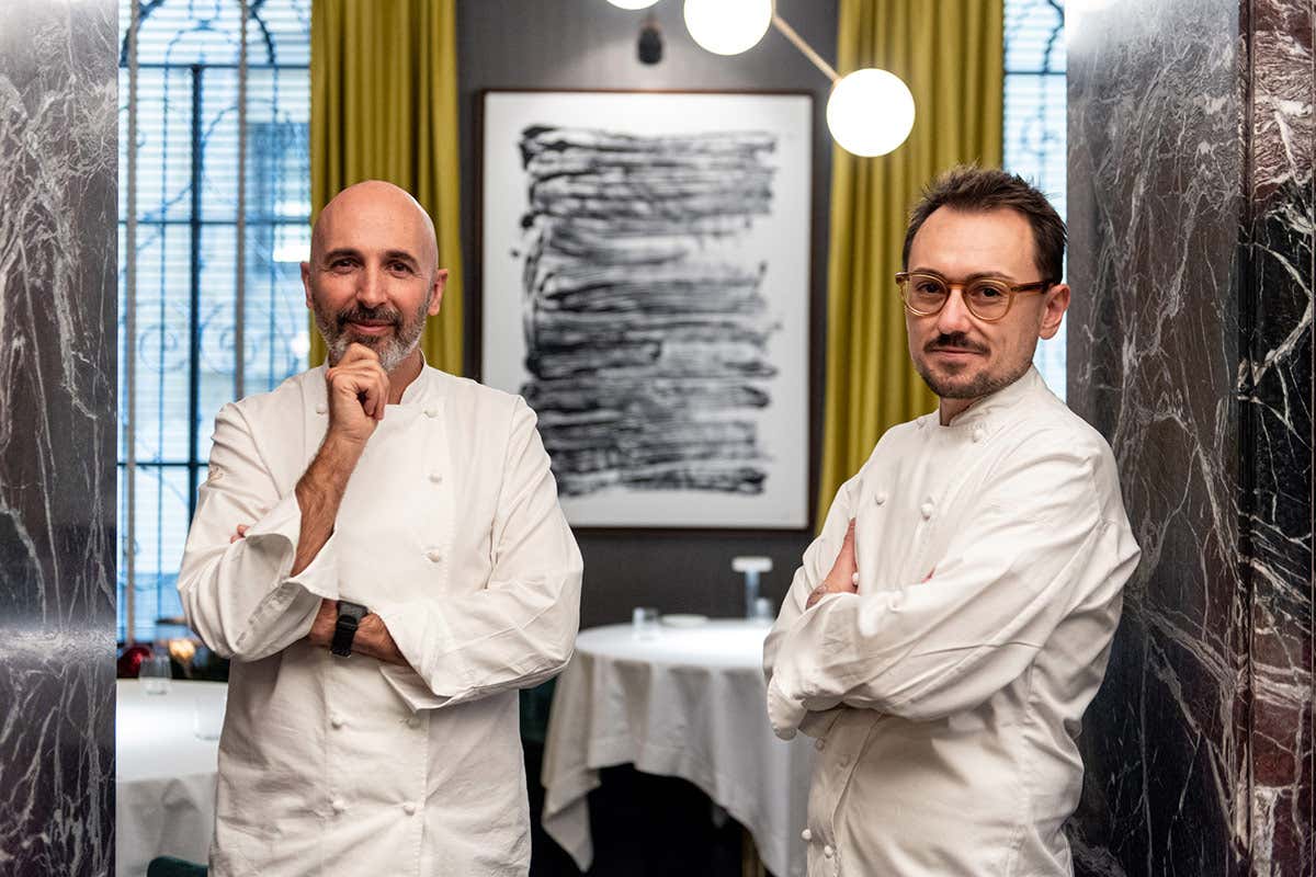 Il ristorante gastronomico, che si affianca al bistrot aperto nel 2018 con Andrea Ribaldone, è partito nel 2020 in periodo di pandemia con l’affiancamento di Federico Sgorbini a Ribaldone, che già avevano lavorato insieme in passato. Ne è nato un sodalizio di grande spessore che si ritrova spesso e che si concretizza in 4 esclusivi menu degustazione da tre, quattro e cinque portate e un menu “a mano libera” dello chef. L’ultimo è riservato solo a chi siede allo chef’s table - un tavolo (per un massimo di sei persone) in essenza di palissandro, con inserti in ottone nero laccato e confortevoli sgabelli in velluto blu dallo schienale impreziosito da un tessuto ricamato Hermes - posto proprio di fronte alla cucina aperta e separato dal resto della sala da una parete inframezzata da due grandi aperture.