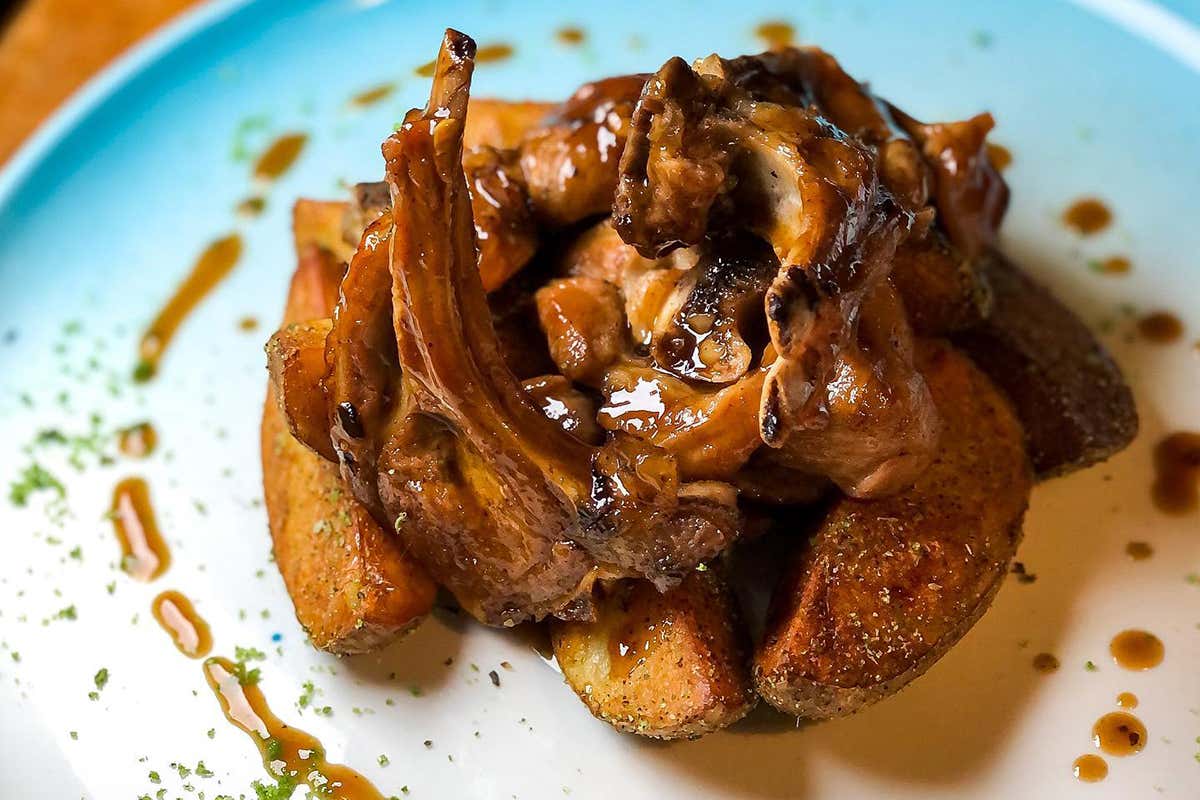 Agnello, cotto lentamente, salsa al limone aromatizzata all’origano e patate al forno