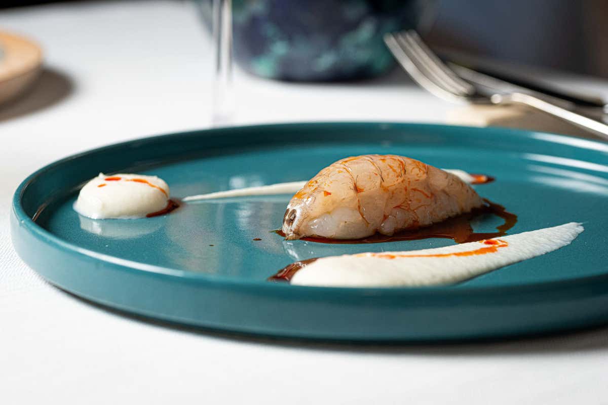 Mazzancolle, delicato di cavolfiore, pannocchia e olio alla paprika