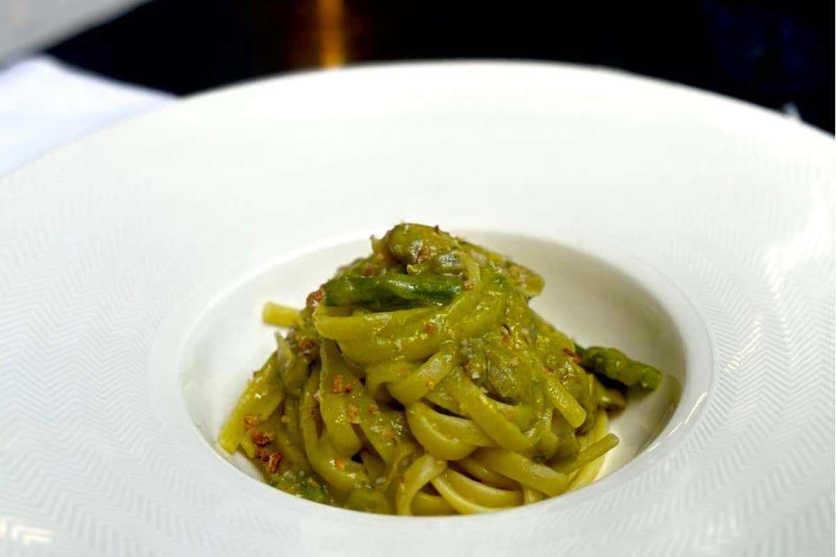Abbiamo assaggiato una serie di antipasti deliziosi: alici in pastella servite su un sottile foglio di carta; un morbido polipo cotto lentamente con una crema di patate, prezzemolo e aceto di mela; pallotte “cacio e ova” con sugo di cicala. Si tratta della ricetta tipica abruzzese, che Alessandra ha modificato, realizzata con sugo di pesce. Ma il fiore all’occhiello è la julienne di seppia tagliata a coltello, crumble e peperone d’Altino, che raccomandiamo a tutti.