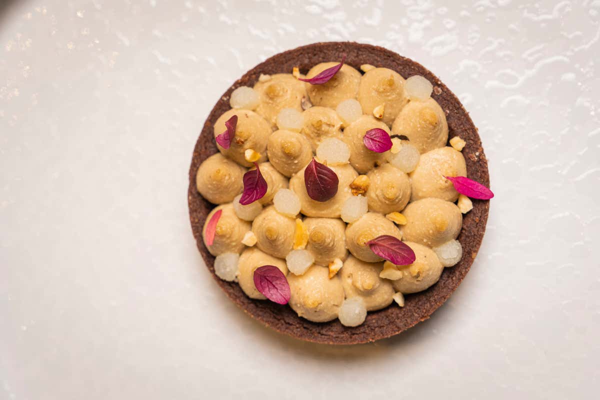 Crostatina al cacao, cremoso alla nocciola e gelatina di pera Foto Laura Bianchi