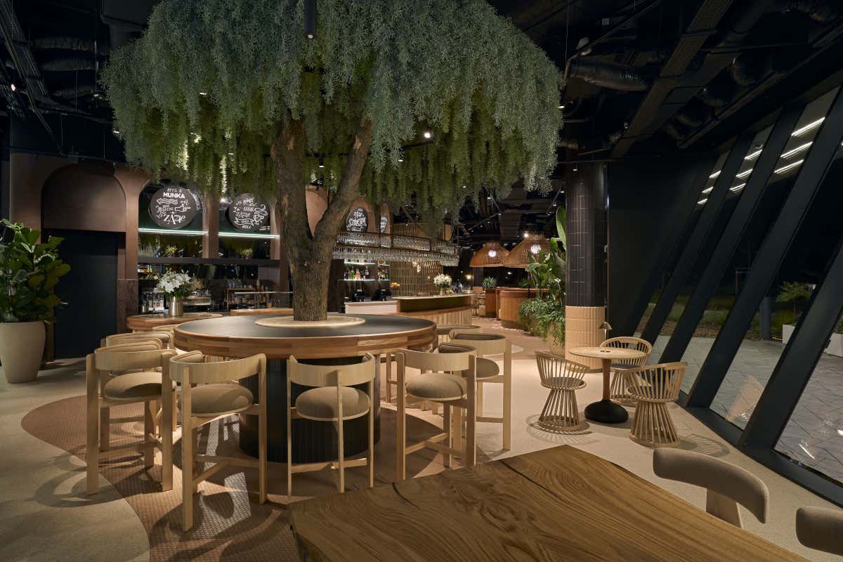 La natura entra con forza dalle ampie vetrate del MOL Campus ma non rimane relegata all’esterno. Tutt’altro, si fa spazio in tutti gli ambienti del bistrot: si può letteralmente abbracciare un albero (vero) nella zona caffetteria, così come ci si può rilassare (o lavorare) nella confortevole area lounge, che evoca un susseguirsi di piccole baie con comodi divani, lampade in vimini, colori e materiali naturali.