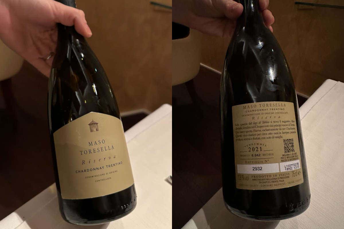 I primi due antipasti prevedono l’abbinamento con il Maso Toresella Chardonnay Riserva Trentino Doc 2021, un vino piacevolmente beverino con un colore giallo oro nel bicchiere. Al naso, si percepisce un leggero sentore di vaniglia seguito da profumi freschi e fruttati di mela gialla e pesca, che emergono con un'ossigenazione leggera. In bocca, il vino è piacevolmente secco e ben bilanciato da una fresca acidità.