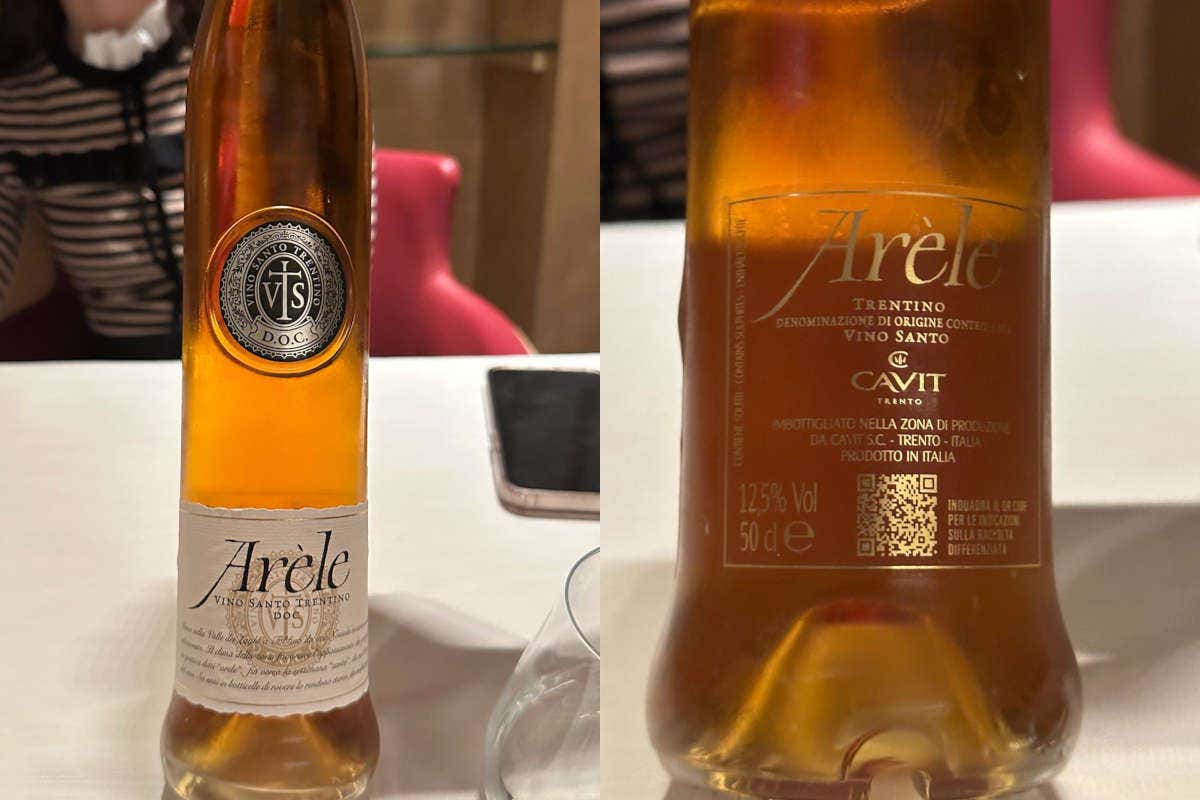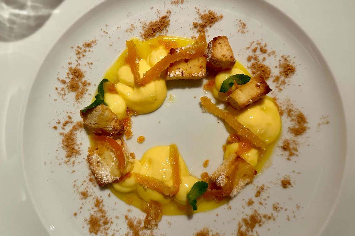 Si chiude ovviamente con il dessert, una torta Meneghina croccante scomposta con crema pasticciera all’arancia e canditi, in abbinamento l’Arèle Vino Santo Trentino Doc.