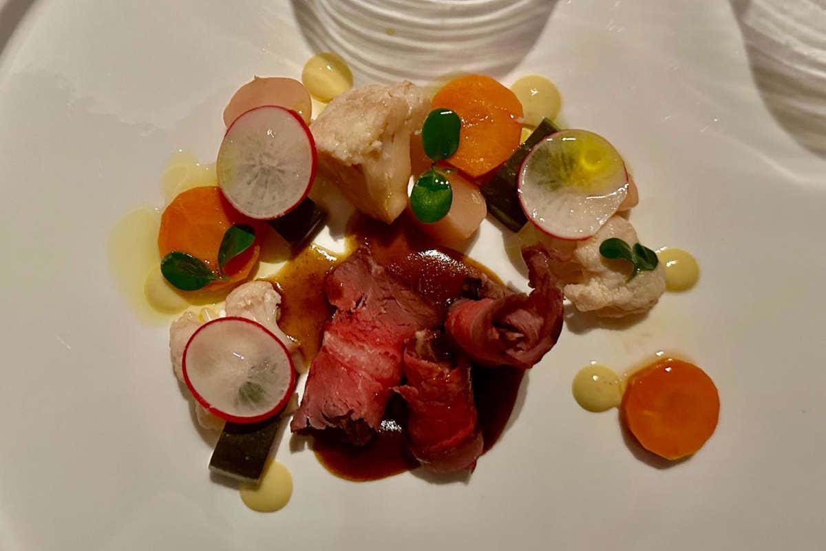 Concludono in bellezza le amuse bouche con il Brasato con giardiniera e salsa di senape «Qui abbiamo la mia versione del brasato, un cappello da prete cotto a bassa temperatura per 23 ore a 58° che rimane perfettamente rosa e si scioglie in bocca. Appoggiato sul suo fondo di cottura che gli conferisce il sapore, ma lo rende comunque molto leggero e digeribile. Come contorno una giardiniera agrodolce con verdure al dente e un filo d’olio Evo di Ascoli» descrive Tano.