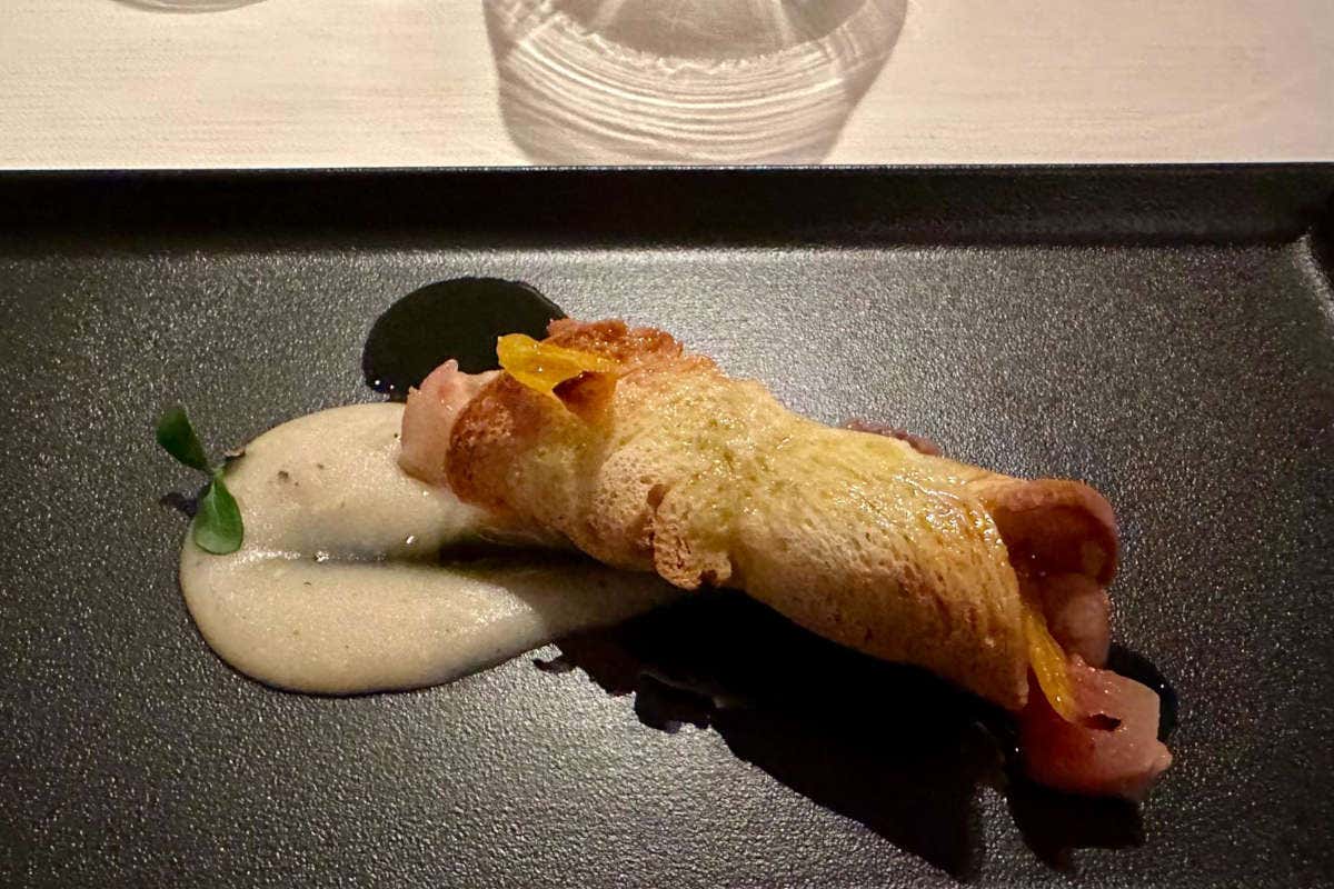 Il menu si apre con il Cannolo di pane, nervetti, pomodorini gialli, cannelini e la sua crema. «Un piatto che riprende il concetto di una volta legato al non sprecare nulla, in questo caso il pane raffermo viene tostato e crea la cialda esterna del cannolo, che poi ho riempito con nervetti, pomodorini e cannellini. Sulla carta sarebbero forse stati meglio gli zolfini, ma i cannellini sono più milanesi!» spiega Tano