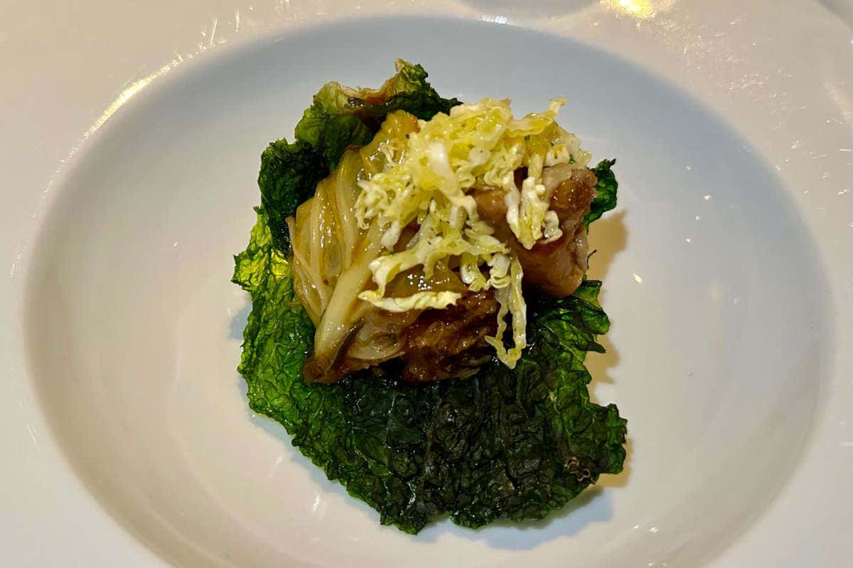 Concludiamo con non poco timore vedendo sul menu come ultima portata la “Casseula”, una pietanza notoriamente pesante e ricca di grassi, ma che lo chef sa interpretare ancora una volta in una versione light «Per ottenere la consistenza croccante che va a creare la cialda che sta alla base, la verza viene sbollentata in acqua e zucchero e poi messa nei silpat e fatta cuocere a 50° per tre giorni. All’interno della cialda abbiamo i tagli tipici della Casseula, il musetto, il verzino e la costina. Alla base un pesto di verza e verza cruda a condire il tutto» spiega Tano