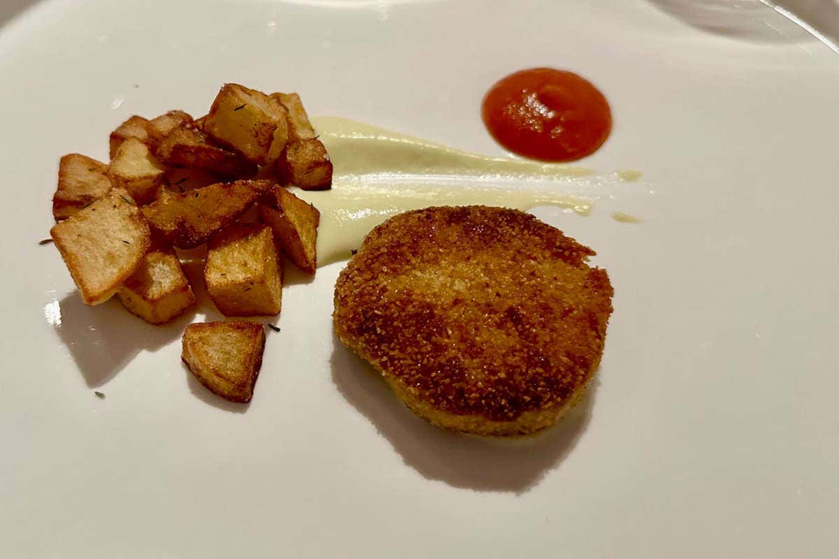 Per prima la Cotoletta con ketchup, maionese di albume e patate fritte in olio Evo «Anche in questo caso è la mia versione di un piatto tipicamente milanese: la cotoletta. Arriva da un magatello che viene cotto a bassa temperatura per 9 ore a 61°, una volta tolto dal sottovuoto viene impanato in questa sequenza: miele, pane, uovo e pane. La cottura avviene sempre in olio extravergine come per le patatine. La maionese è fatta con albume, più leggera perché presenta il 3% di grassi contro i 60% di quella fatta con il tuorlo. In questo modo cerco di alleggerire le pietanze il più possibile»
