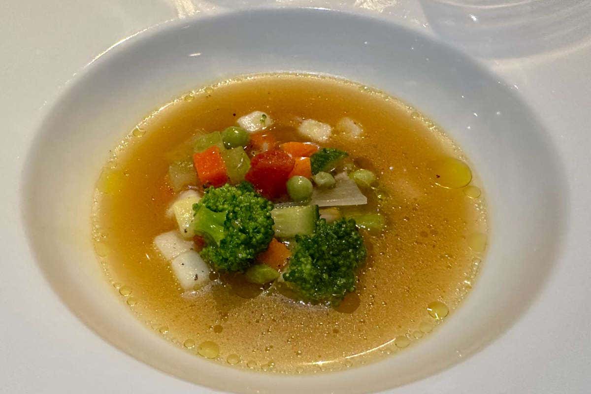 La prima portata vera e propria del menu è il Minestrone tiepido «Si tratta di un minestrone con 12 verdure, in cui abbiamo il contrasto tra le verdure che sono fredde e il brodo che è caldo. Di solito nel minestrone ci va la pasta o il riso, ma in questo caso è la croccantezza delle verdure al dente a replicare la consistenza. Quasi a decorare il piatto, nel brodo, si formano “perle” di olio Evo per il contrasto di densità»