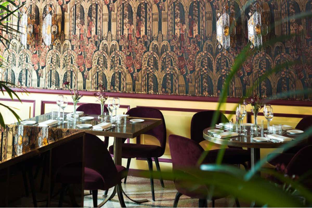 Il pregiato tessuto jacquard di Prelle, storica manifattura francese specializzata nelle stampe Art Déco, riveste le panche e una parete del ristorante, mentre gli elementi in ottone illuminano e dinamizzano lo spazio, valorizzando con contrasti cromatici le modanature dello spazio. Le pareti verde olio sono impreziosite dai dettagli in stucco a contrasto di colore borgogna caldo e dalle lussuose tende in raso di seta verde oliva.
