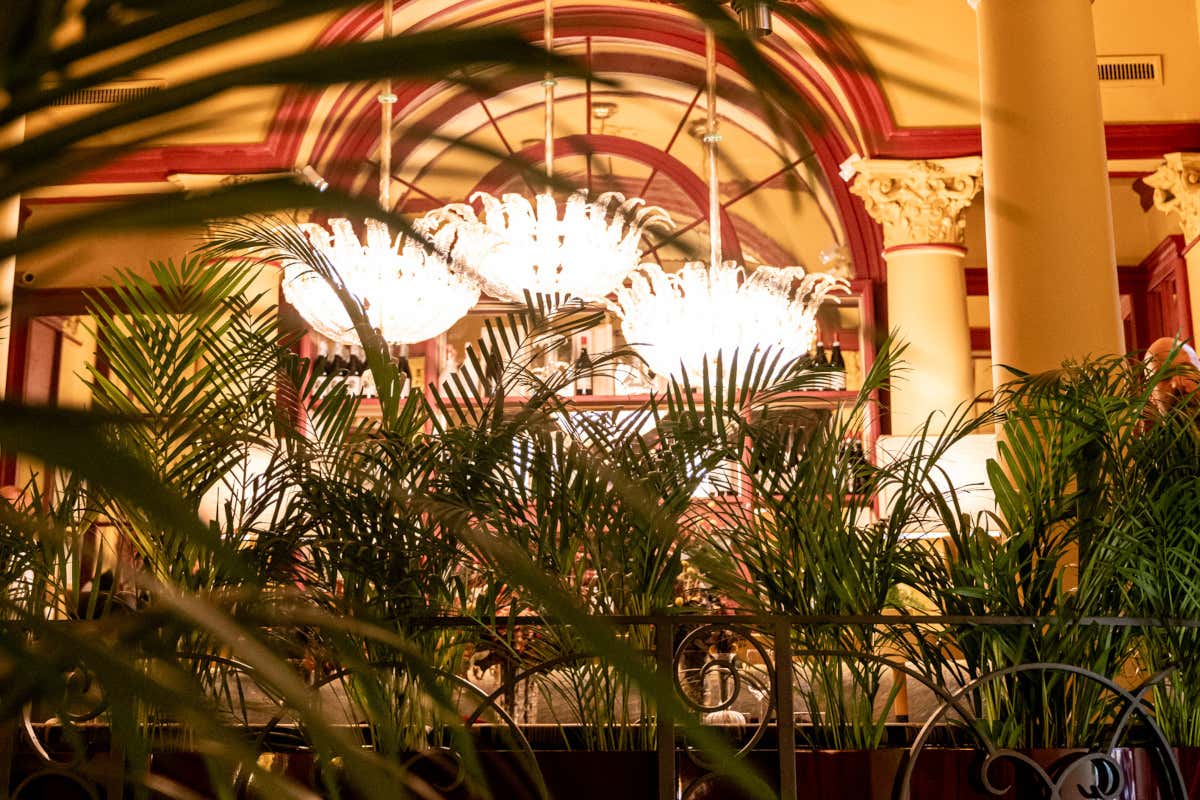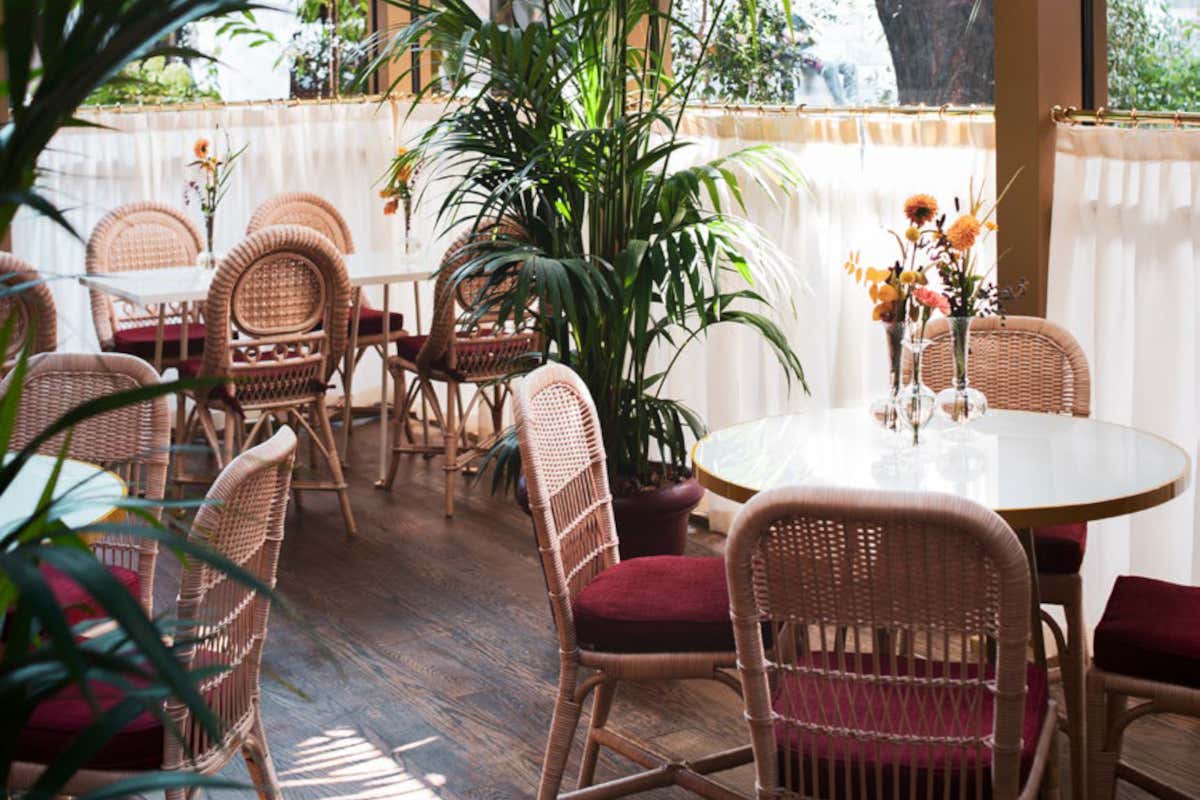 Anche le piante sono un elemento importante: da decoro/divisorio nella sala principale, diventano avvolgenti nel dehors, creando una piacevole luce filtrata attraverso il grillage in bambù e ottone del soffitto in quello che sembra un piccolo angolo di quiete lontano dalla frenesia cittadina.