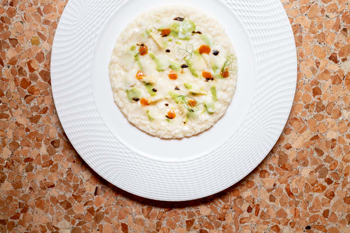 Accanto ai piatti ormai signature, insostituibili poiché firma della personalità gastronomica del Caruso Nuovo Bistrot, si affiancano le proposte del menu primaverile, con un occhio di riguardo alle sfumature del verde e alle primizie di stagione. Tra queste un’insalata di mare contemporanea, con salsa di lattuga, acqua di pomodoro, e diversi pesci con molteplici cotture, ma anche - tra i primi - Come un risotto a primavera, nelle intenzioni degli chef un’ode ai vegetali e ai sapori freschi e profumati di questa stagione in cui l’estrazione di asparago bianco, le fave, i piselli, gli asparagi, vengono completati dal succo concentrato di arancia che dona una spinta frizzantina al piatto.