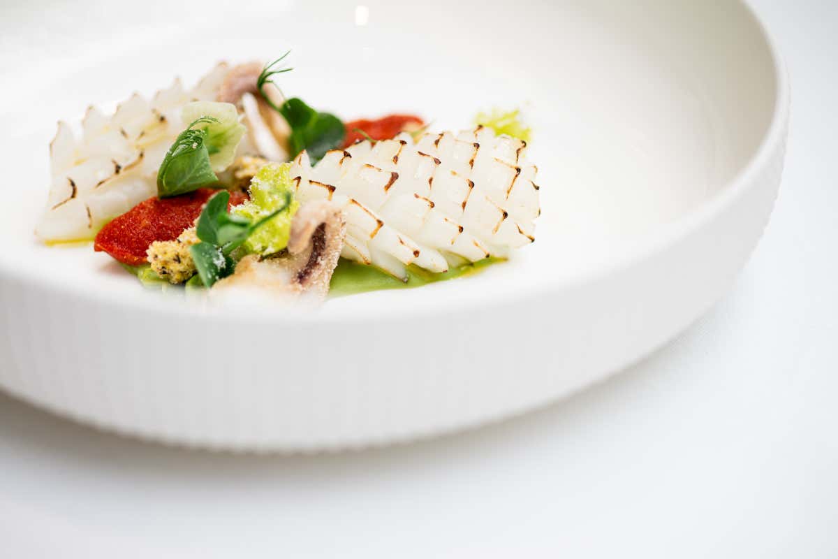 La cena in anteprima si è aperta con una entrée di alto livello, pur dal nome apparentemente semplice, ma che presenta complessità e sapori inaspettati solo per chi non conosce lo chef Esposito: seppia e piselli. Si tratta di un piatto in cui nessun elemento viene sprecato: l’osso essiccato della seppia viene grattugiato come elemento di sapidità, mentre i piselli in varie consistenze permettono di giocare con i sapori del piatto che, uniti con la menta, regalano una nota balsamica, mentre con i baccelli si fa il brodo utilizzato per la cottura della seppia. Ad esaltare il piatto un Fiano di Avellino Docg della Tenuta Scuotto.