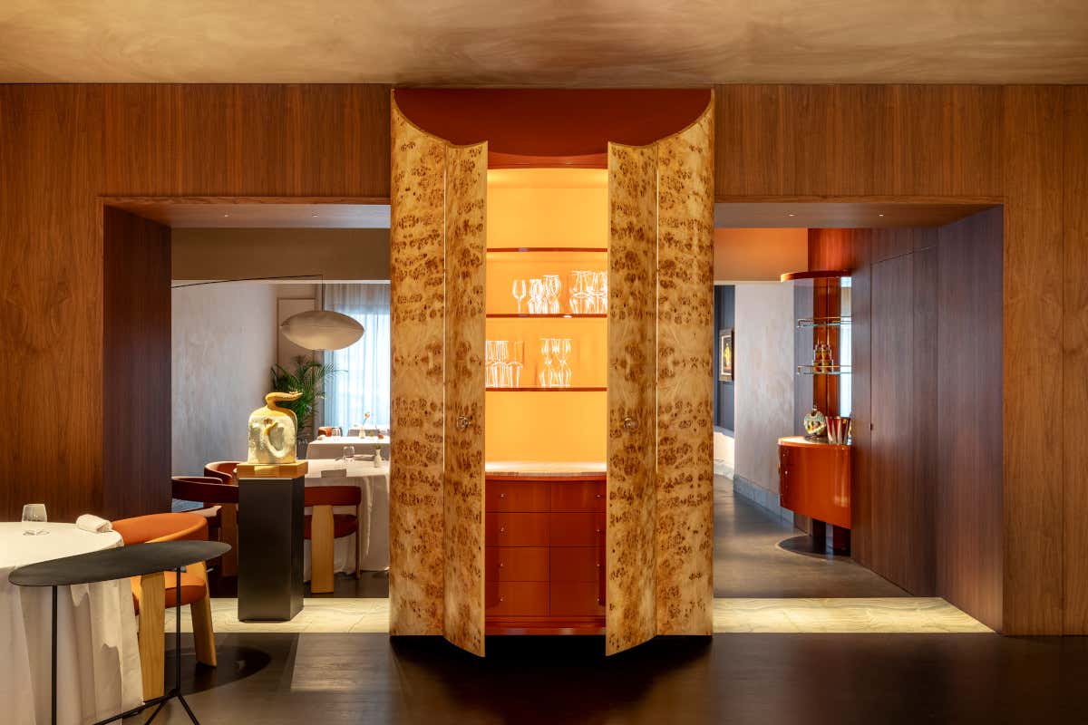 I tavoli sono rotondi e ampi, ammantati da tovaglie di lino, per un’esperienza di degustazione elegante. Il marmo cipollino spazzolato corre lungo le pareti delinea a terra una sottile linea d'ombra. L'elemento centrale è un imponente armadio bifacciale in radica di olmo con finitura opaca, che si affaccia su entrambe le sale, le cui forme morbide si contrappongono alla boiserie di noce che le separa, reinterpretando in modo contemporaneo un elemento tradizionale. L'esperienza de La Madia va oltre il semplice gusto. L'obiettivo è quello di valorizzare l'esperienza dell'ospite attraverso un gioco di proporzioni sensoriali, dove la vista, il gusto e l'olfatto si fondono creando una sinestesia unica.