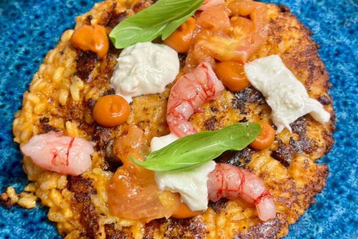 Riso al salto profumato con pomodoro arrosto, stracciatella di burrata e gamberi rossi al crudo di Unico