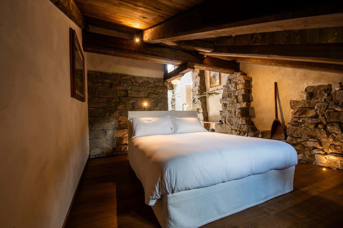 “Camera Terra” (piano terra, senza barriere architettoniche / doppia standard, 20 mq): soluzione con letto matrimoniale, ambiente dall'atmosfera intima con pareti in pietra e giardino privato.