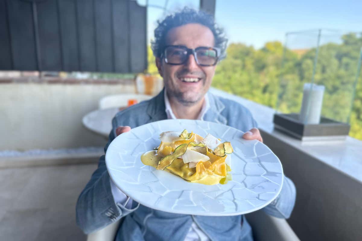 Federico Minghi e il Tortello, zucchine, gota cotta, salume tipico di Colle di Val d‘Elsa e pesto di basilico di BIS