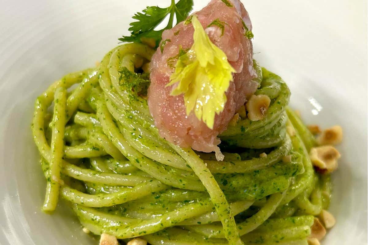 Spaghettoni Felicetti con pesto di rucola, nocciole tostate, crudo di dentice e lime di Osteria Il Platano. Foto: Facebook Osteria Il Platano