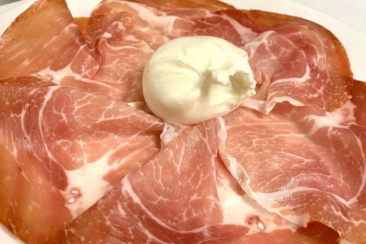 Culatta di Langhirano con la burratina d’Andria di Osteria Il Platano. Foto: Facebook Osteria Il Platano