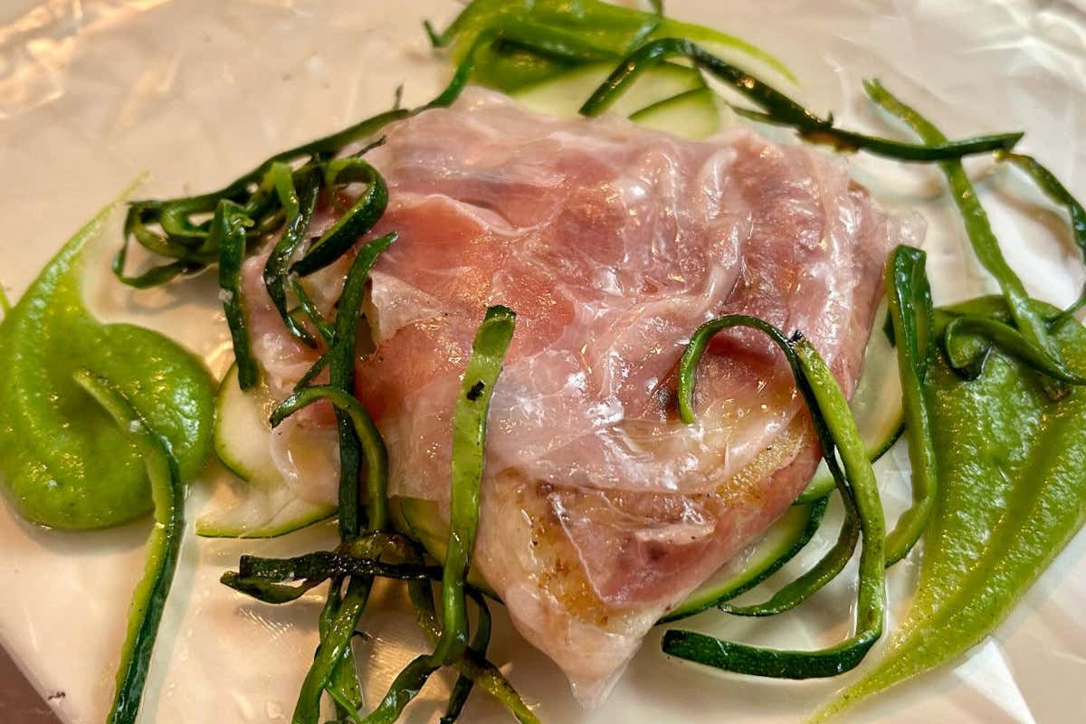 Razza piastrata, velo di pancetta, zucchina in tre consistenze di Osteria Il Platano. Foto: Facebook Osteria Il Platano