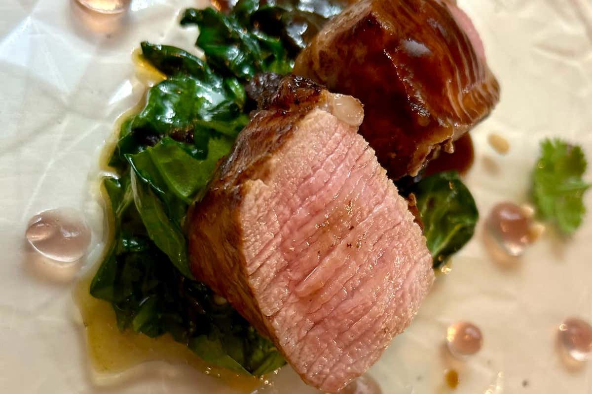 Medaglione di vitello in crepinette con spinaci, uvetta, pinoli e la guarnizione di gel al mirto di Osteria Il Platano. Foto: Facebook Osteria Il Platano