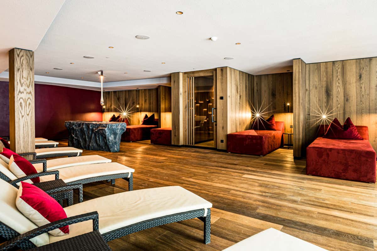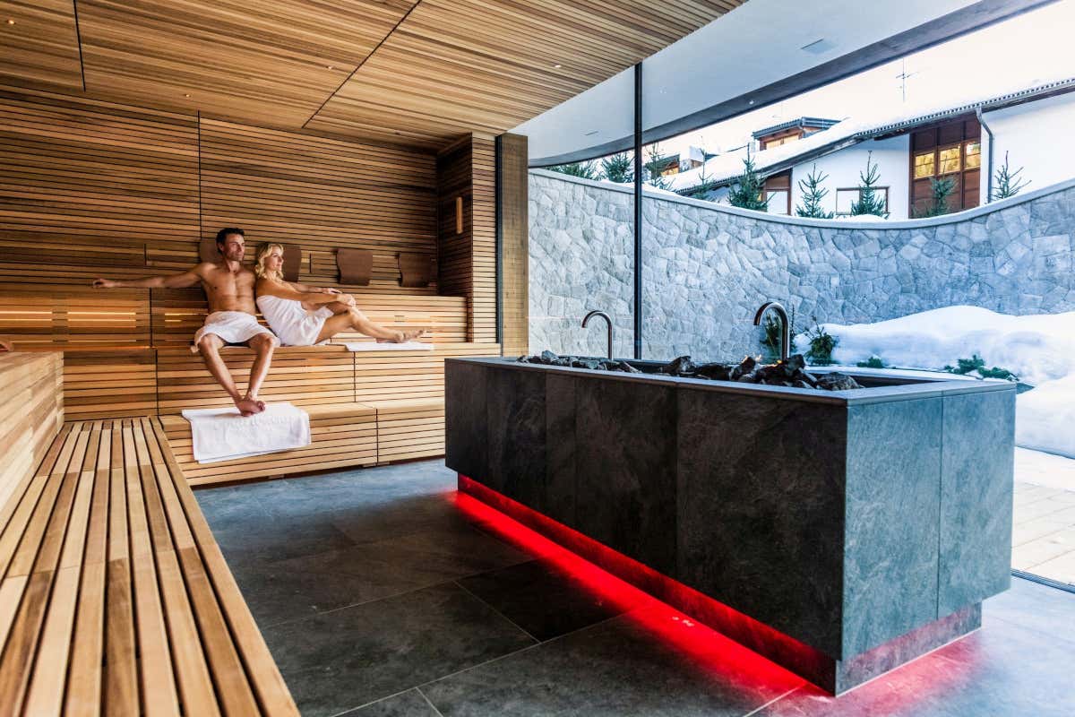 Un'area centrale della Spa è dedicata alla piscina, con acqua riscaldata a 32°C, che si estende in un continuum tra la vasca coperta e la piscina panoramica esterna, dove è possibile nuotare circondati dalla neve. L'area include anche lettini con bollicine e vasche idromassaggio, sia interne che esterne, per un completo rilassamento. Il percorso benessere continua con varie saune e un'area dedicata alla purificazione del corpo, dove gli ospiti possono scegliere tra una sauna finlandese, un bagno turco aromatico, una grotta di neve, un'oasi salina con grotta e piscina, e una sauna al fieno. Sono disponibili anche saune private per chi desidera maggiore privacy.