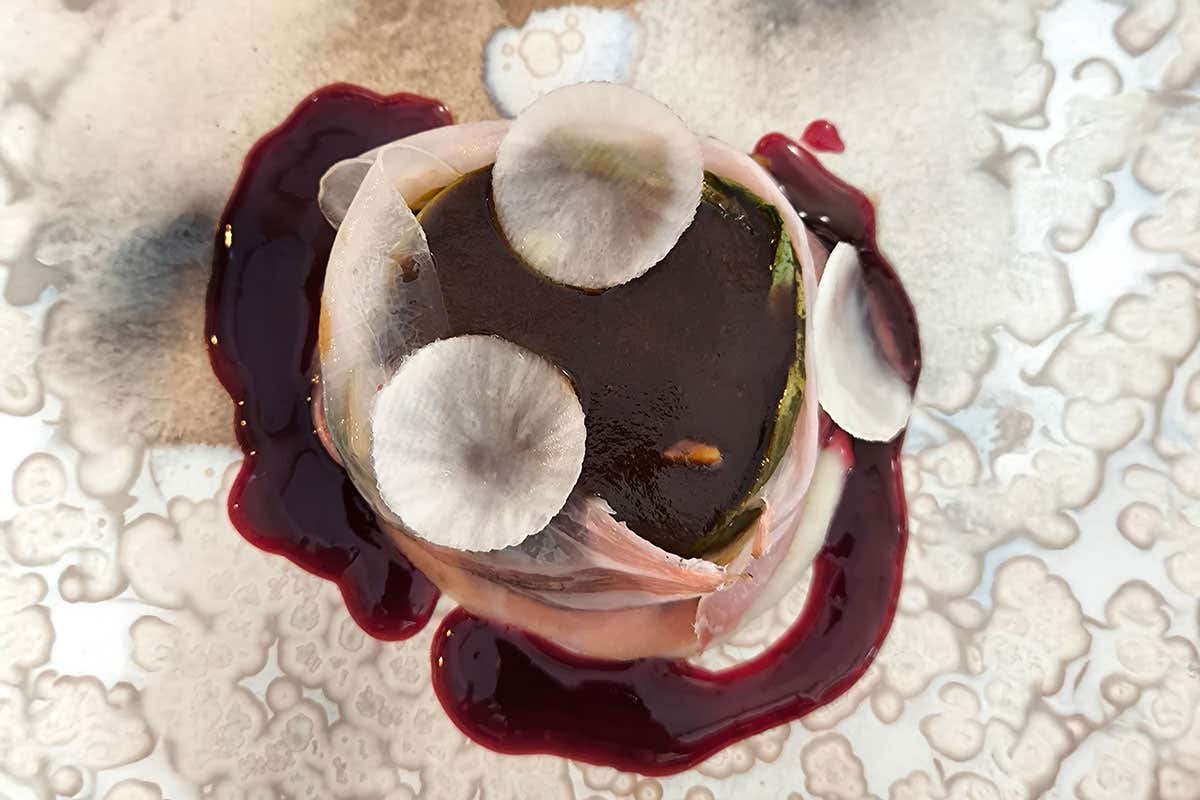 Dagli antipasti che aprono la mente e spostano i confini, si arriva al Tagliolino, erbe amare, carciofi e bottarga. Il servizio in sala è una ballata che esalta il godimento dei sensi, le posate diventano protagoniste di un continuo cambio d'abito, un gioco che riporta l'attenzione sui dettagli e la danza delle forchette di Munari sussurra nella mente.