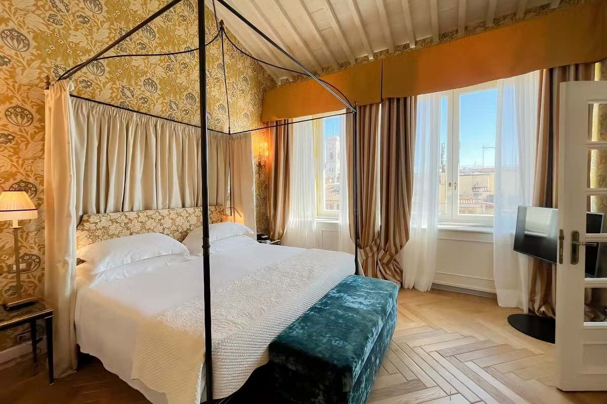 - La Suite 560, di 66 metri quadrati, si affaccia direttamente sulla cupola del Brunelleschi e sul campanile di Giotto. Il suo stile riflette il gusto dell'ala Helvetia, con dettagli classici come i bagni rivestiti in marmo bicolore e l'elegante salotto in stile francese. Allo stesso tempo, l'influenza dell'ala Bristol è evidente nel letto a baldacchino e nei complementi d'arredo dipinti a mano. La disposizione degli ambienti comprende due bagni, uno principale con vasca e doccia separate e uno di servizio, a conferma di una concezione dell'ospitalità che punta su funzionalità e bellezza.