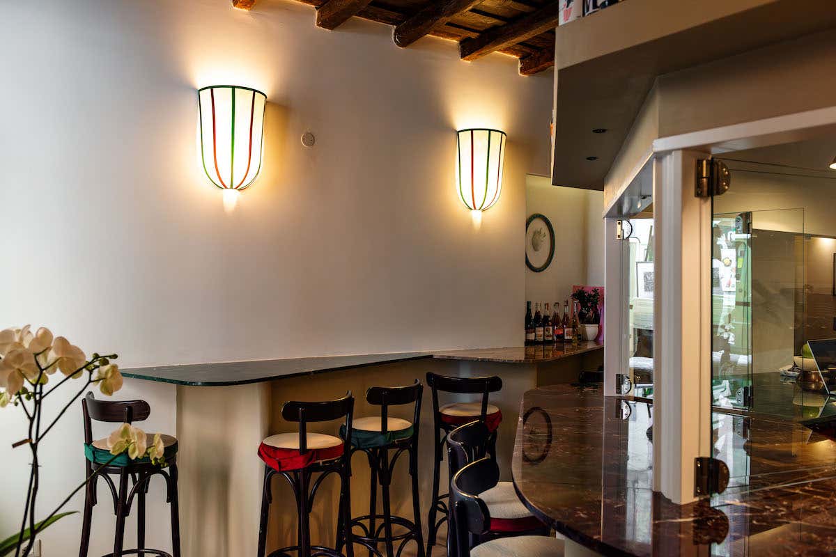 Il progetto architettonico è stato affidato allo studio romano StubeStudio, che ha creato un ambiente minimale dai toni chiari, con tavoli in marmo dalle forme morbide. La cucina a vista è il fulcro del locale, insieme allo chef’s table, pensato per favorire un rapporto diretto tra cuoco e cliente.