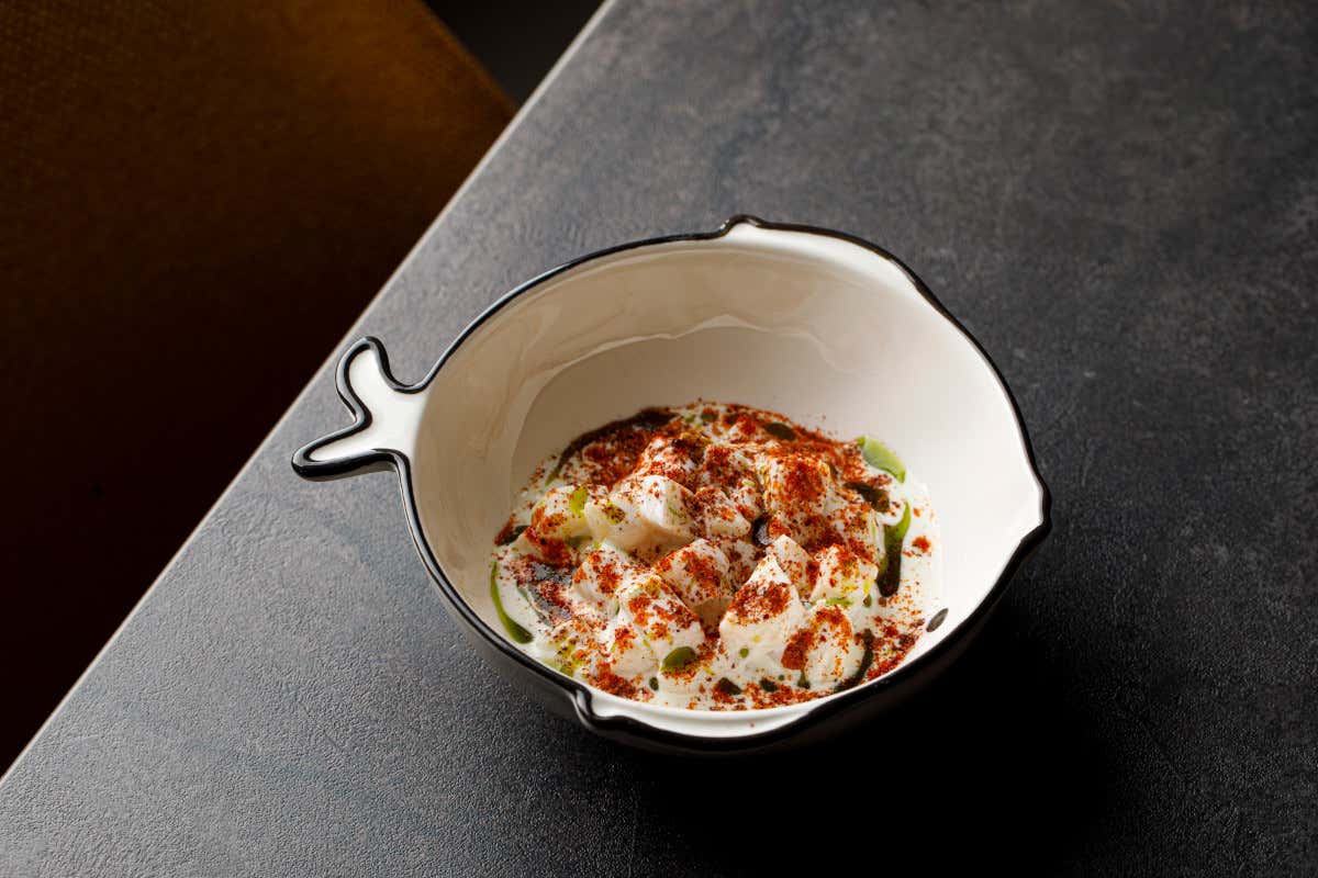 Altro caposaldo è la ceviche di pescato, che nasce dall’unione di due esperienze: l’incontro con un giovane cuoco peruviano che gli fece assaggiare la sua versione tradizionale, e la memoria della ceviche assaporata alla scuola di Robuchon. La base è classica – macerazione in lime e un pizzico di sale – ma è arricchita da una crema di latte che dona rotondità e profondità al gusto. A completare: olio all’habanero, olio all’erba cipollina, sumak, paprika e piment d’espelette.
