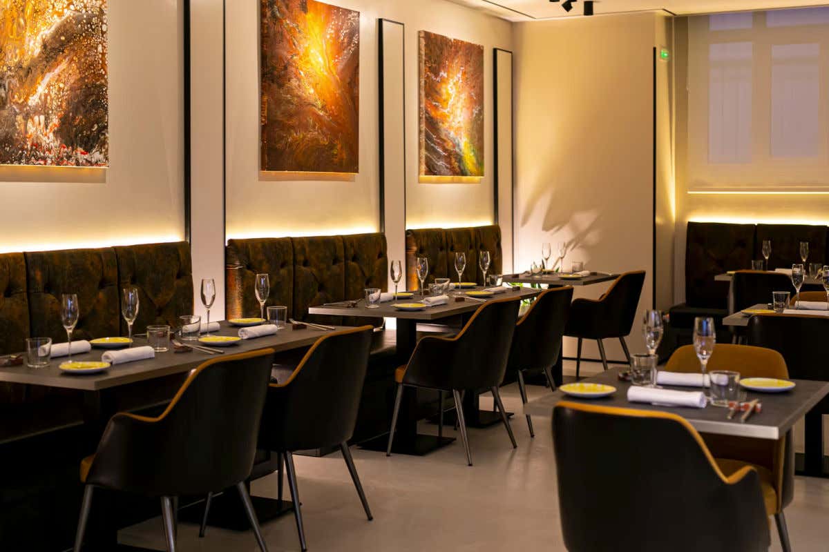 La sala viene dopo, senza muri di separazione: è uno spazio molto rigoroso, moderno, sobrio e di un'eleganza pulita ed essenziale che sembra equlibrare la cucina a vista. Lo spazio è unico e su una parete di fondo ci sono quadri che richiamano pietre e marmi antichi, quasi a evidenziare quel mix fra classico e contemporaneità che è un po' il senso del locale dei suoi menù.