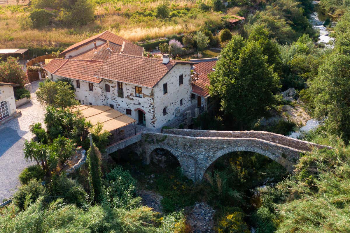 Imperia, bella città di mare che vale una visita, è a pochi minuti d'auto da Dolcedo, nell'entroterra ligure. Qui Jacopo Chieppa e la moglie Melania Cammalleri hanno ridato vita a un vecchio mulino di inizio '900 trasformandolo in un ristorante dall'atmosfera romantica, complice anche il contesto naturale, di grande fascino. Se l'interno del ristorante è frutto di una ristrutturazione intelligente che del mulino ha recuperato diversi elementi, accanto alla struttura, illuminato di notte, si trova il Ponte dei Cavalieri di Malta, un arco in pietra, che attraversa il torrente Prino e risale al XIII secolo. Un luogo suggestivo, quindi, che all'ambientazione unisce una valenza gastronomica notevole.