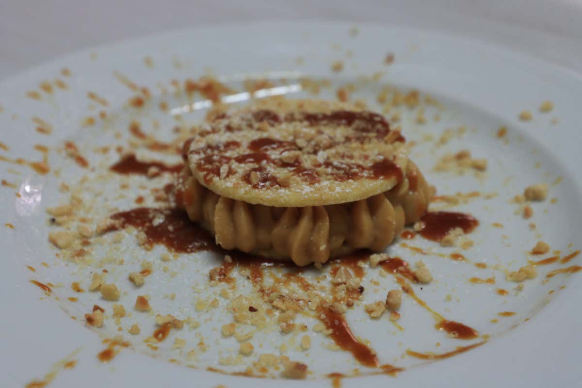 Pavlova ai frutti rossi (Meringa, panna, frutti rossi.)Choux Craquelin al limone (Zeppola con copertura croccante e crema al limone, strepitosa). Semisfera golosa (Crème brulée, caramello salato, briciole di meringa e arachidi tostate, frutti rossi, semisfera di caramello croccante). Delizia al pralinato con nocciole e caramello salato (delizia di nome e di fatto). Nostri biscotti con vinsanto o vino passito.