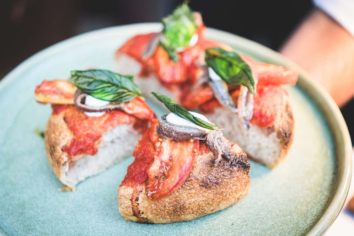 Pizza padellino con San Marzano confit, alici di Cetara e basilico cristallizzato, Osteria della Pista