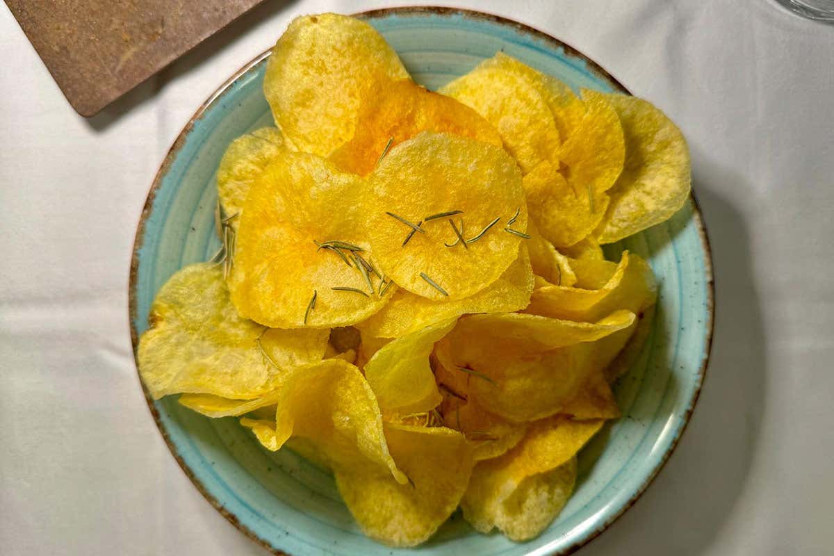 «Un'altra cosa che facciamo da sempre - ricorda Taiano - è offrire a tutti i clienti, quando si siedono al tavolo, un piattino di patatine, sono delle chips fatte in casa, patata fresca, che friggiamo e diamo nell'attesa del piatto. Sono cresciuto qua, quando ero piccolo, la prima cosa che ho imparato a fare era pelare le patate, perché adesso abbiamo le macchine, però io mi mettevo in cucina, pelavo le patate con la mandolina. Dall'Osteria della Pista non si può uscire se non sono arrivate le patatine».