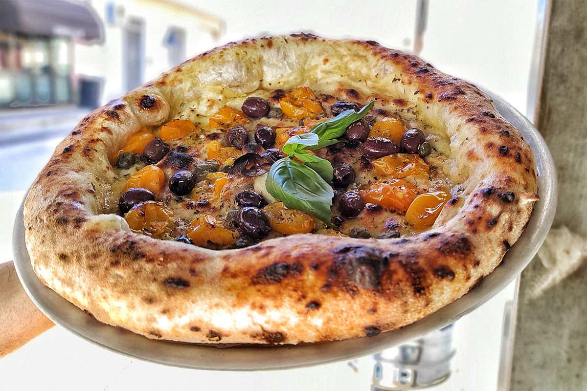 Margherita Corbarì con basilico, Mozzarella di Bufala Campana Dop, olio extravergine d'oliva e pomodoro di Corbara, da cui il nome alla pizza.