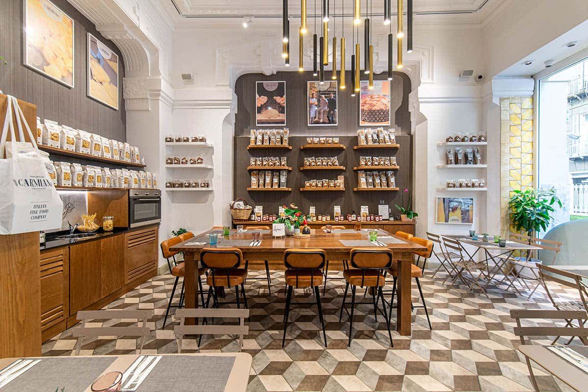 Il progetto architettonico e il design degli interni - firmati da JC&Partners servizi di architettura - rispettano la storicità del luogo: sono stati ripristinati gli stucchi e i fregi che ornavano i soffitti, inserendo nel contempo materiali caldi ed eleganti e colori che rimandano all’oro delle spighe di grano e al nero della terra. Lo spazio ruota intorno al bancone del pane in noce e al grande tavolo in legno massello da dieci posti che all’occorrenza accoglie live cooking di maestri panificatori e chef stellati. La cucina è a vista e i tavoli bistrot, tra dentro e fuori, ospitano fino a 50 persone. All’esterno i tavolini godono della tranquillità della strada chiusa al traffico.